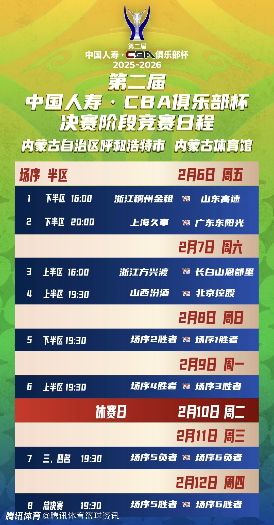 第二届中国人寿-CBA俱乐部杯决赛阶段竞赛日程出炉。今年2月,相约呼和浩特,见证冠军诞生!