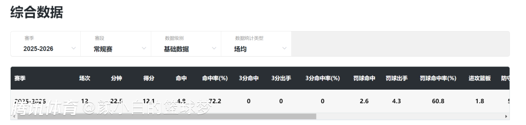 本赛季王哲林场均22.6分钟,拿到12.1分7.1篮板1.5助攻0.4抢断1.2盖帽,命中率72.2%,罚球命中率60.8%,这是王哲林职业生涯效率最高的时刻,场均1.2盖帽也是21-22赛季后最高,换言之体能充足时大王也能护筐。