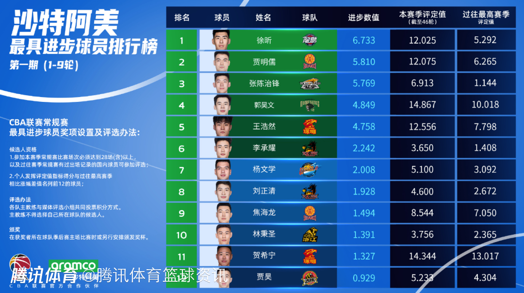 【2025-2026赛季CBA联赛第1-9轮沙特阿美最具进步球员排名第一——徐昕】