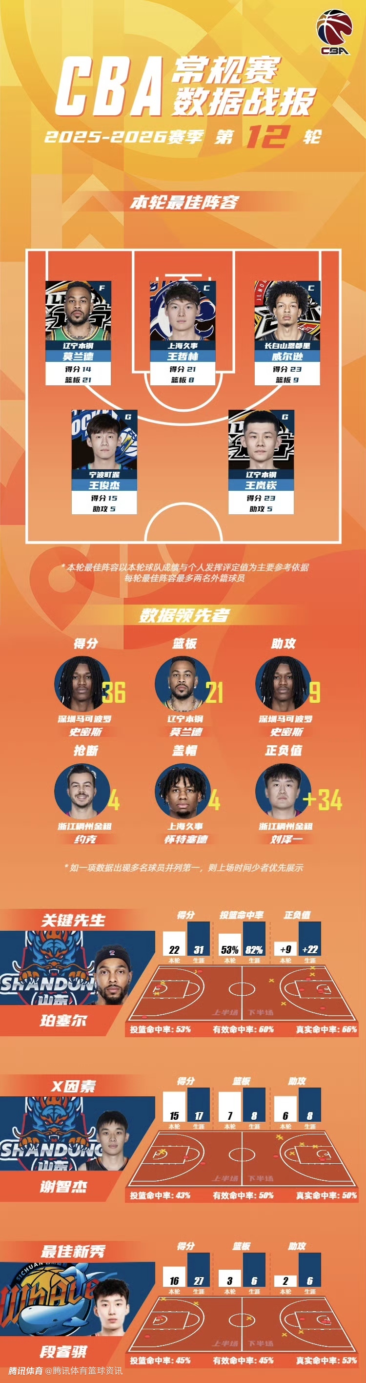 北京时间1月10日,CBA联赛官方公布了常规赛第12轮数据战报,来自上海久事大鲨鱼的王哲林(21分8篮板),吉林东北虎男篮的威尔逊(23分9篮板),宁波富邦町渥男篮的王俊杰(15分5助攻),辽宁沈阳三生飞豹篮球俱乐部的莫兰德(14分21篮板)和王岚嵚(23分5助攻)入选CBA联赛常规赛第12轮最佳阵容。