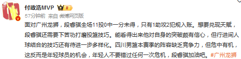 媒体人付政浩发文点评:面对广州龙狮,段睿骐全场11投0中一分未得,只有1助攻2犯规入账。想要兑现天赋,段睿骐还需要下苦功打磨投篮技巧。能看得出来他对自身的突破颇有信心,但行进间人球结合的技巧还有待进一步多样化。