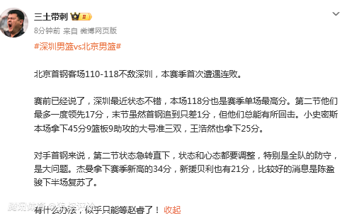 媒体人三土带刺发文点评:“赛前已经说了,深圳最近状态不错,本场118分也是赛季单场最高分。第二节他们最多一度领先17分,末节虽然首钢追到只差1分,但他们总能有所回击。小史密斯本场拿下45分9篮板9助攻的大号准三双,王浩然也拿下25分。”