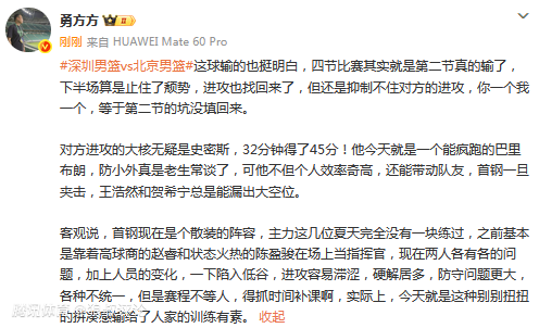 媒体人勇方方发文点评:这球输的也挺明白,四节比赛其实就是第二节真的输了,下半场算是止住了颓势,进攻也找回来了,但还是抑制不住对方的进攻,你一个我一个,等于第二节的坑没填回来。