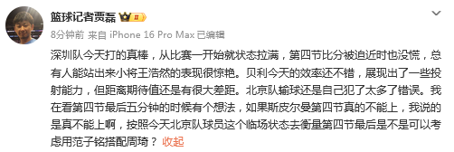 篮球记者贾磊发文点评:“深圳队今天打的真棒,从比赛一开始就状态拉满,第四节比分被迫近时也没慌,总有人能站出来小将王浩然的表现很惊艳。贝利今天的效率还不错,展现出了一些投射能力,但距离期待值还是有很大差距。”
