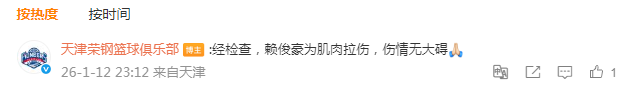 “经检查,赖俊豪为肌肉拉伤,伤情无大碍。”天津男篮官方社媒写道。
