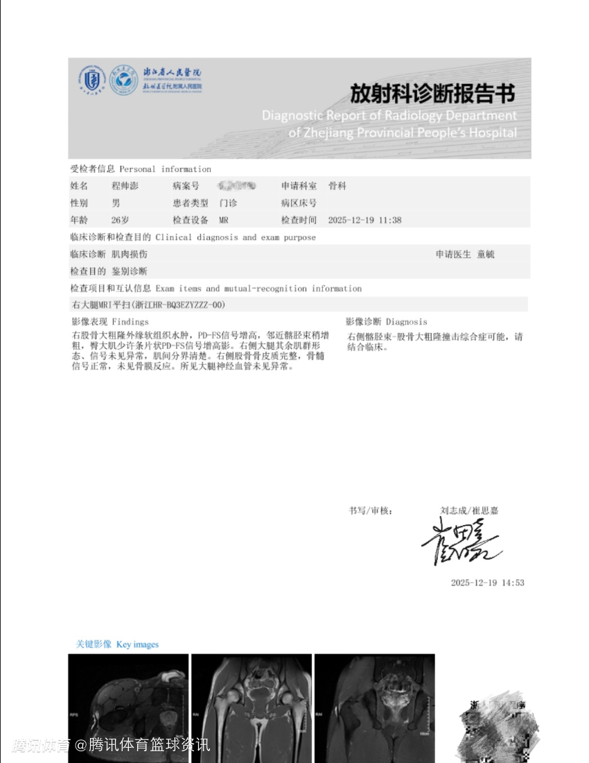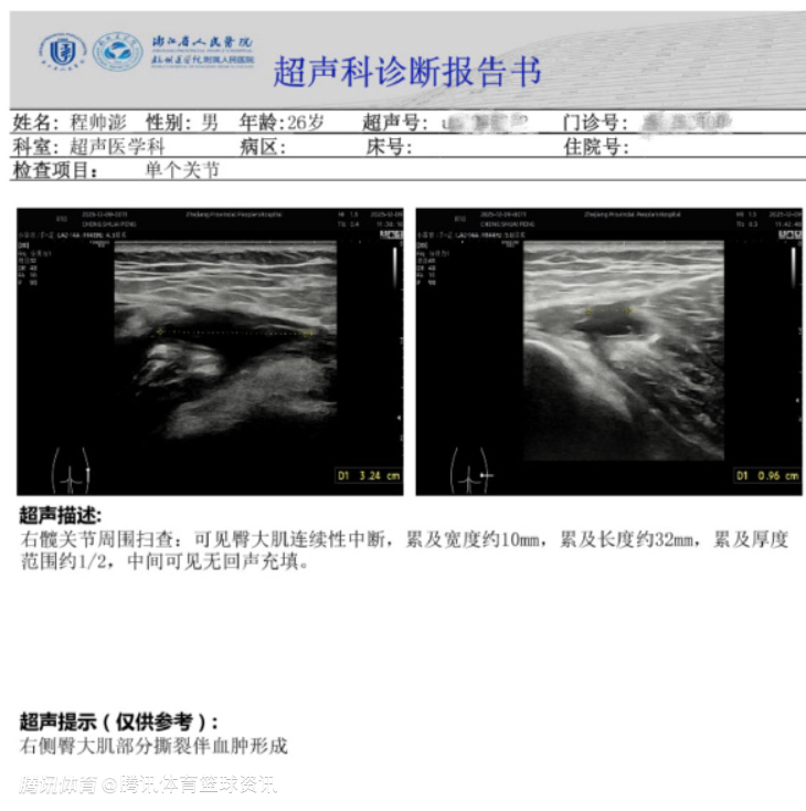 伤情通报|根据俱乐部合作定点医疗机构浙江省人民医院超声、影像结果以及运动创伤骨科主任毕擎诊断评估:我俱乐部球员程帅澎右侧臀大肌部分撕裂,预计需要伤停45天。