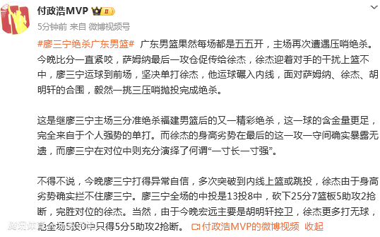 广东男篮果然每场都是五五开,主场再次遭遇压哨绝杀。今晚比分一直紧咬,萨姆纳最后一攻仓促传给徐杰,徐杰迎着对手的干扰上篮不中,廖三宁运球到前场,坚决单打徐杰,他运球碾入内线,面对萨姆纳、徐杰、胡明轩的合围,毅然一挑三压哨抛投完成绝杀。”