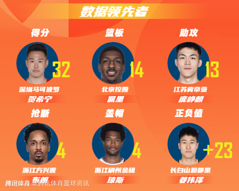数据领先者方面:深圳男篮球员贺希宁以单场32分的数据领衔得分榜; 北控男篮球员佩里以单场14个篮板的数据领衔篮板榜; 江苏男篮球员庞峥麟以单场13次助攻领跑助攻榜; 浙江广厦球员布朗以单场4次抢断的数据领衔抢断榜; 浙江男篮球员琼斯以单场4次封盖的数据领跑盖帽榜; 吉林男篮球员姜伟泽以+23的正负值领先。