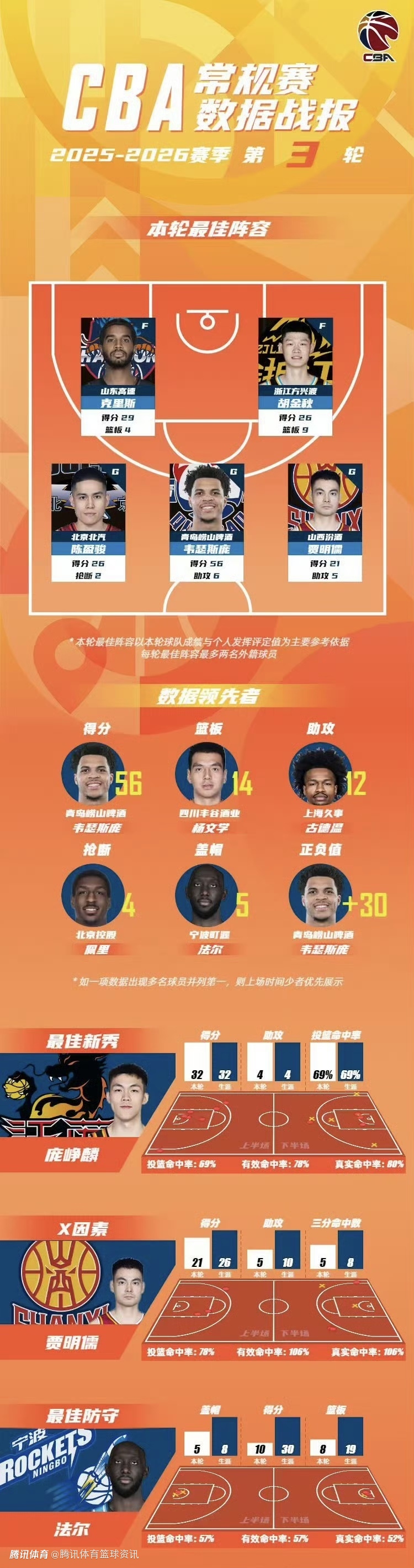 北京时间12月20日,CBA联赛官方发布常规赛第3轮数据战报,山西男篮克里斯(29分4篮板)、广厦男篮胡金秋(26分9篮板)、北京男篮陈盈骏(26分2抢断)、青岛男篮韦瑟斯庞(56分6助攻)和山西男篮贾明儒(21分5助攻)入选CBA联赛常规赛第3轮最佳阵容!