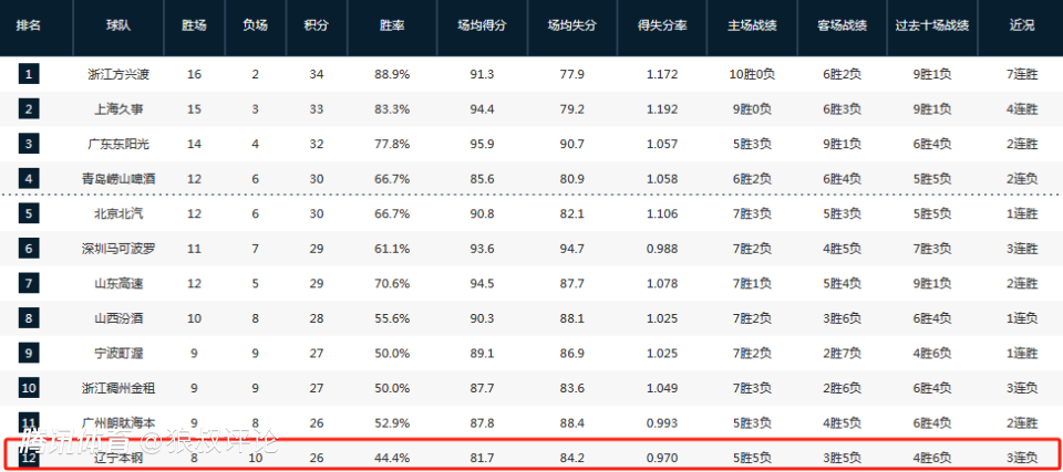 新赛季至今,辽宁取得8胜10负的战绩,跌至积分榜第12名。