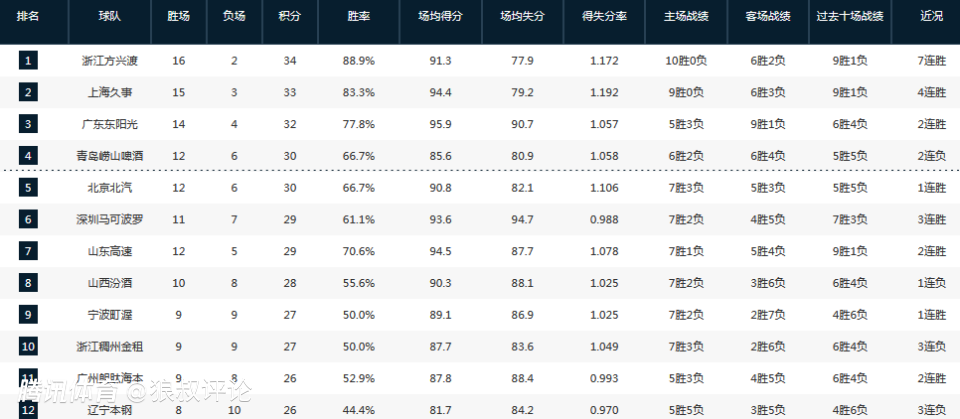 对于积分榜的影响相对比较大,上海4连胜冲上了积分榜第二,山东近11战10胜上升到第七,辽宁则是跌至第十二,南京一波9战8败跌至第十八。
