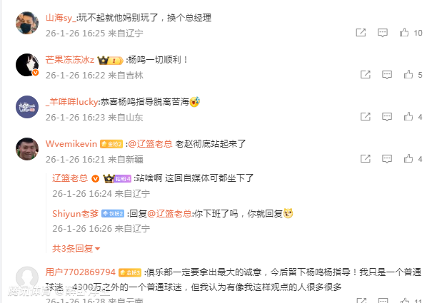 对于杨鸣如今主动请辞,辽篮官微下舆论普遍认为杨鸣解脱了: