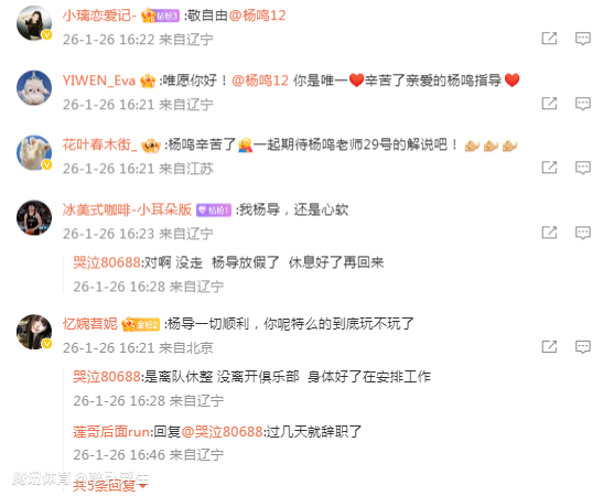 无条件支持尊重杨导的选择,2020年因杨导关注辽篮,从此追比赛赴现场。这五年辽篮给过我们巅峰荣耀,也有低谷的沉默。喜悦遗憾交织,从未在任何情况说过对球队、球员不好的话,始终维护相信。杨导以赤诚待辽篮,以真心维护球迷,却扛了太多重压,太多莫须有的非议。希望他卸下疲惫,自在随心,前路皆坦。