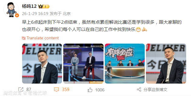 “早上6点起床到下午2点结束,虽然有点累但解说比赛还是学到很多,跟大家聊的也很开心,希望我们每个人可以在自己的工作中找到快乐。”回归解说的工作结束后,杨鸣在社媒上写道。