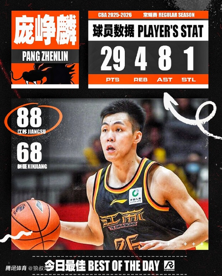 江苏球员庞峥麟出战35分钟,投篮14中9、三分5中3、罚球9中8砍下29分4篮板8助攻1抢断。其中,下半场爆砍17分成为江苏击败新疆的绝对核心球员。