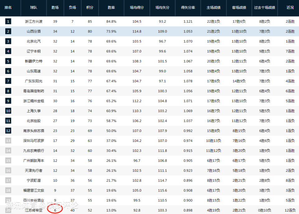 本场比赛过后,江苏的战绩为6胜15负,6场比赛的胜利,已经追平了上个赛季的6胜40负。