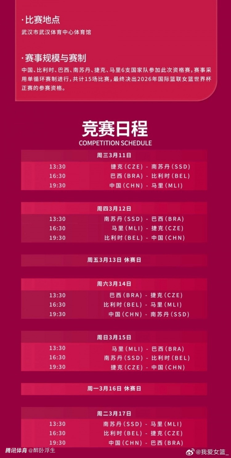 2026年女篮世界杯预选赛将于3月11日-17日举办,中国女篮将坐镇主场武汉比赛。中国女篮的5场比赛具体赛程时间出炉,中国女篮均是19点30的黄金时间比赛,首场比赛是3月11日对阵马里女篮,收官战是3月17日对阵巴西女篮。