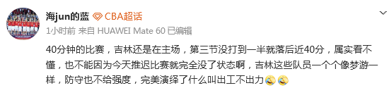 媒体人“海jun的蓝”发文点评:40分钟的比赛,吉林还是在主场,第三节没打到一半就落后近40分,属实看不懂,也不能因为今天推迟比赛就完全没了状态啊,吉林这些队员一个个像梦游一样,防守也不给强度,完美演绎了什么叫出工不出力。
