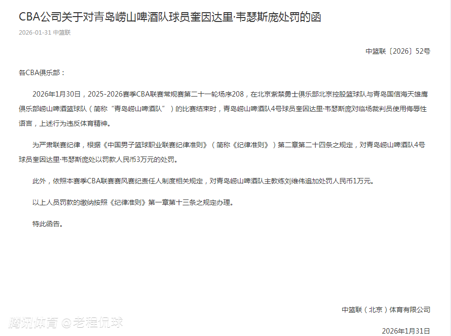 CBA官方表示:“上述行为违反体育精神。为严肃联赛纪律,根据联赛规则,对韦瑟斯庞处以罚款人民币3万元的处罚。”