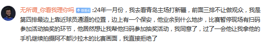 有球迷点评说道:24年一月份,我去看青岛主场打新疆,前面三排不让坐观众,我是第四排最边上靠近球员通道的位置,边上有一个保安,他业余到什么地步,比赛暂停现场有扫码参加活动抽奖的环节,他居然想让我帮他扫码参加抽奖活动,我同意了,过了一会他让我拿他的手机继续拍摄阿不都沙拉木的比赛画面,我直接拒绝了