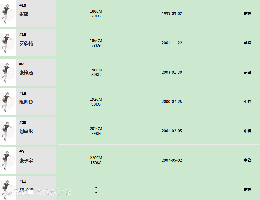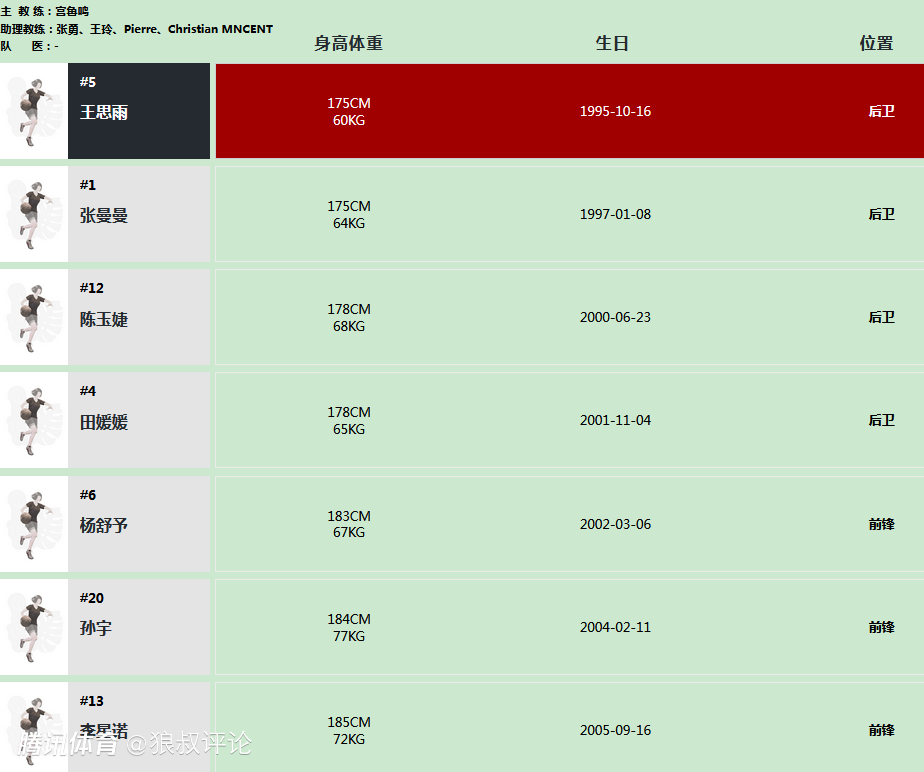 前锋:杨舒予,孙宇,李星诺,张茹,罗欣棫,张梓涵,唐子婷