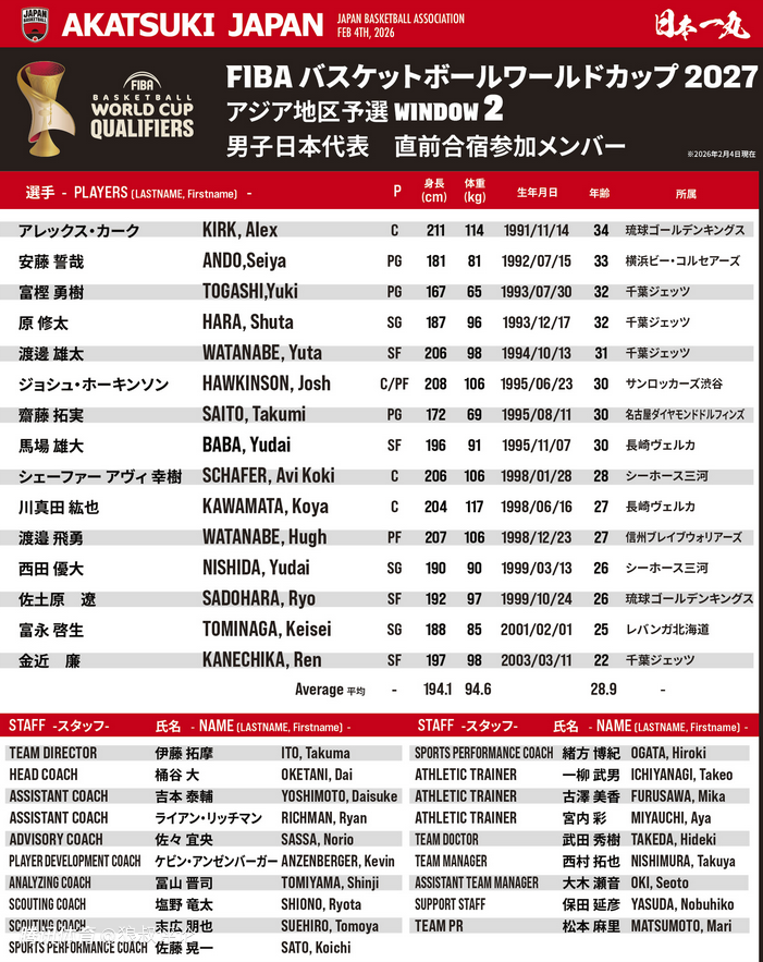 另外值得一注意的是日本男篮平均身高只有1米94,平均年龄达到了28.9岁,大部分都是已经进入到成熟阶段的运动员为主,从集训时间可以看到大幅度减少,2月17日集结后,2月26日就主场迎战中国男篮,仅仅一周多时间。