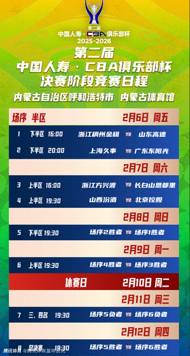 第二届CBA俱乐部杯决赛阶段揭幕战定于2月6日16:00打响,2月12日19:30进行总决赛,期间八强球队浙江稠州、山东高速、上海久事、广东东阳光、浙江方兴渡、吉林长白山恩都里、山西汾酒、北京控股将在内蒙古自治区呼和浩特市内蒙古体育馆,按照对阵进行单败淘汰赛,最终产生本届杯赛所有名次。