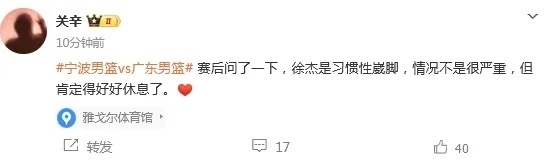当时广东体育记者关辛发文报道,徐杰是习惯性崴脚,情况不是很严重,但肯定得好好休息了。