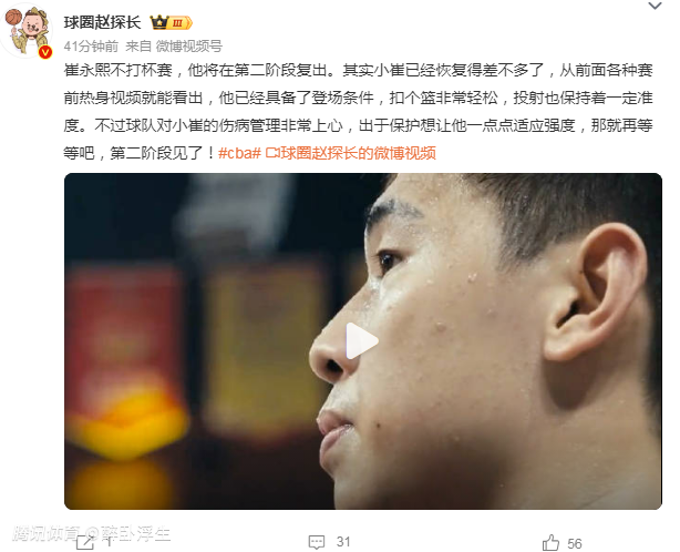 “不过球队对小崔的伤病管理非常上心,出于保护想让他一点点适应强度,那就再等等吧,第二阶段见了!”