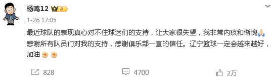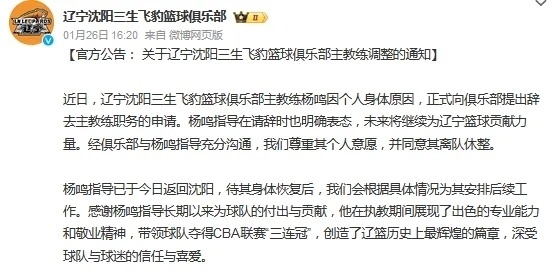 1月26日,辽宁男篮官方社媒发文,杨鸣正式卸任辽篮主帅的位置,对此,杨鸣表示:最近球队的表现真心对不住球迷们的支持,让大家很失望,我非常内疚和惭愧。