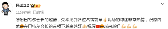 赛后,前辽宁男篮主帅杨鸣更新社媒发文:“感谢巴特尔会长的邀请,荣幸见到各位名宿前辈,现场的球迷非常热情,祝愿内蒙,在巴特尔会长的带领下越来越好,祝愿越来越好。”