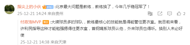 当有网友表示:“北京最大问题是教练,教练换了,今年几乎稳冠军了”时,媒体人付政浩并不这么认为。