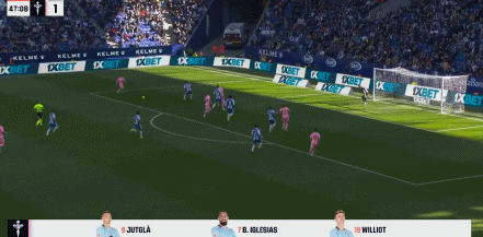 第38分钟,塞尔塔右路传中,尤特格拉后点包抄得手,1-0领先西班牙人。