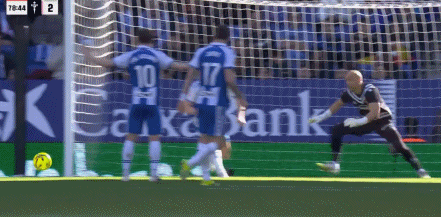 第66分钟,基克禁区内拿球,连续摆脱防守抽射得手,西班牙人扳平1-1。