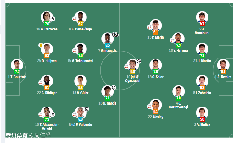 未登场替补:13-卢宁、20-弗兰·加西亚、23-费兰·门迪、10-姆巴佩、30-马斯坦托诺、17-阿森西奥、38-帕拉西奥斯