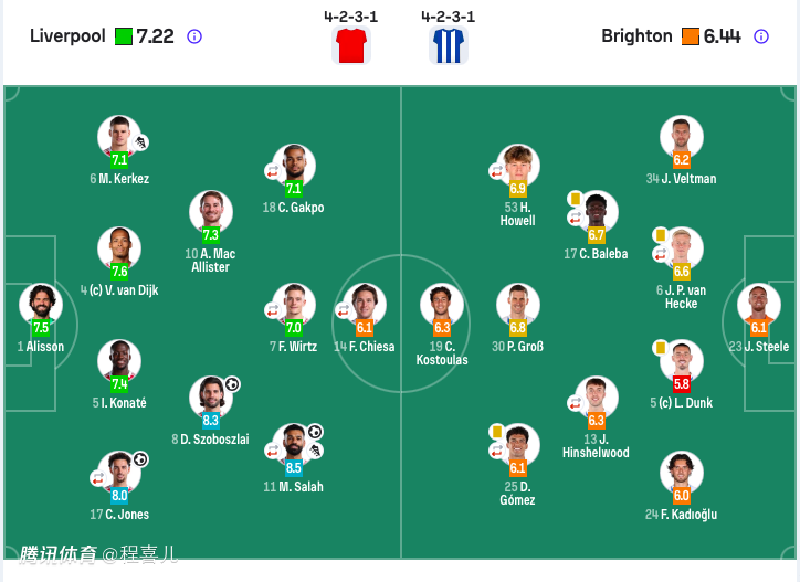 布莱顿首发:23-斯蒂尔、5-邓克、6-范赫克、30-格罗斯、19-科斯托拉斯。