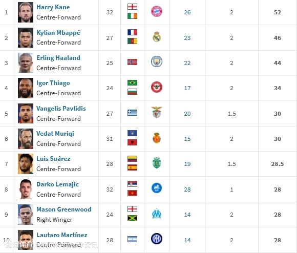 本轮比赛中,基利安·姆巴佩未能出战,仍以23球位列第二;埃尔林·哈兰德则以22球排名第三。