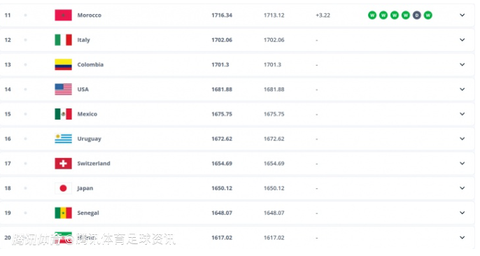 FIFA年终排名前20如下: