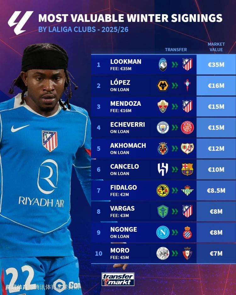 其他上榜球员包括从曼城转投赫罗纳的克劳迪奥·埃切维里(1500万欧)等。