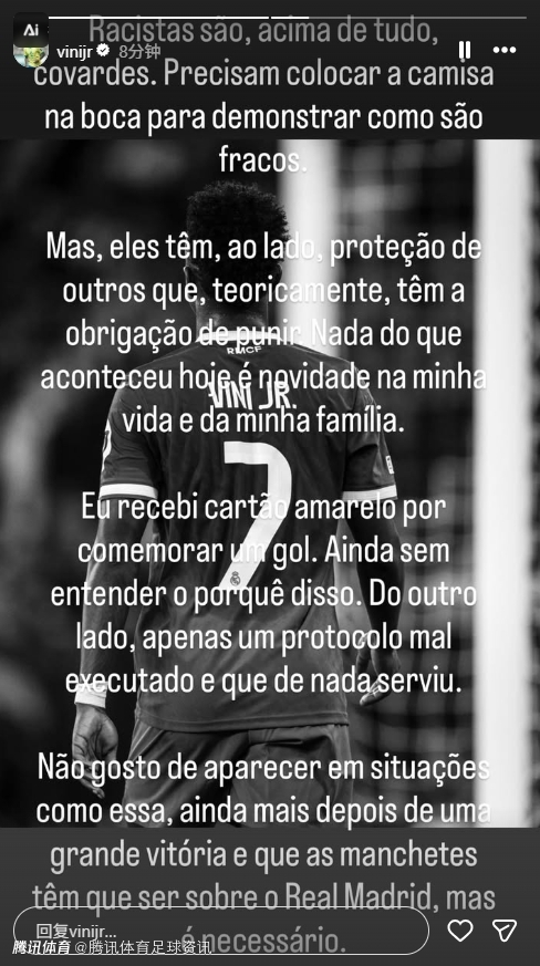 赛后,维尼修斯通过社交媒体发表声明,直指种族主义者“懦弱”,并质疑相关机制执行不力。他表示,这类事件对自己和球队而言并不陌生,甚至对因庆祝进球而被出示黄牌仍感到不解。