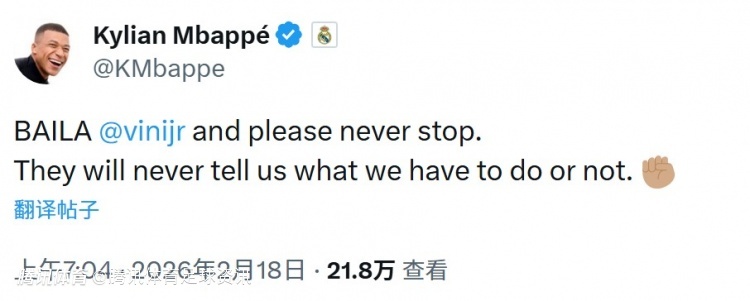 此外,基利安·姆巴佩也在社交媒体上公开声援维尼修斯,鼓励他“继续跳舞”,不要因外界声音而改变自己。