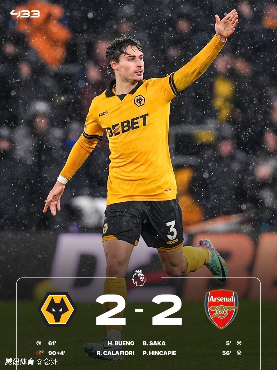 英超第31轮,阿森纳客场2-2狼队,先赛一场情况下5分优势领跑。萨卡破门打破15场进球荒,赖斯助攻,因卡皮耶打入个人处子球,圣地亚哥-布埃诺扳回一球,萨卡伤退,埃多齐补时绝平。
