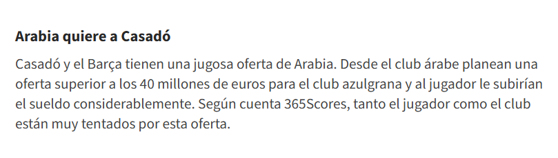 22岁的卡萨多,在巴萨只能算是边缘中场。不过,卡萨多不缺追求者。2月20日,《每日体育报》透露,有沙特豪门将向巴萨送上报价,愿意以超过4000万欧元的高昂价格引进卡萨多,并开出高薪水。这对巴萨和卡萨多来说,都是极具诱惑力的报价。