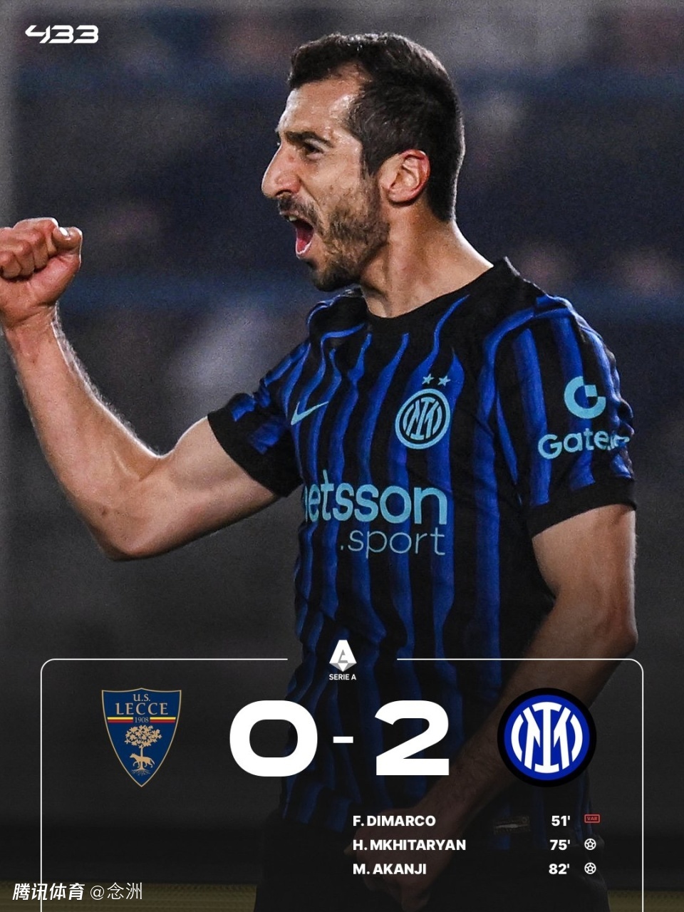 意甲第26轮,国米客场2-0战胜莱切,取得联赛7连胜+14轮不败,先赛领先第2名AC米兰10分。恩里克遭门线解围,迪马尔科进球无效后送角球助攻,姆希塔良替补破门,阿坎吉头球扩大比分。