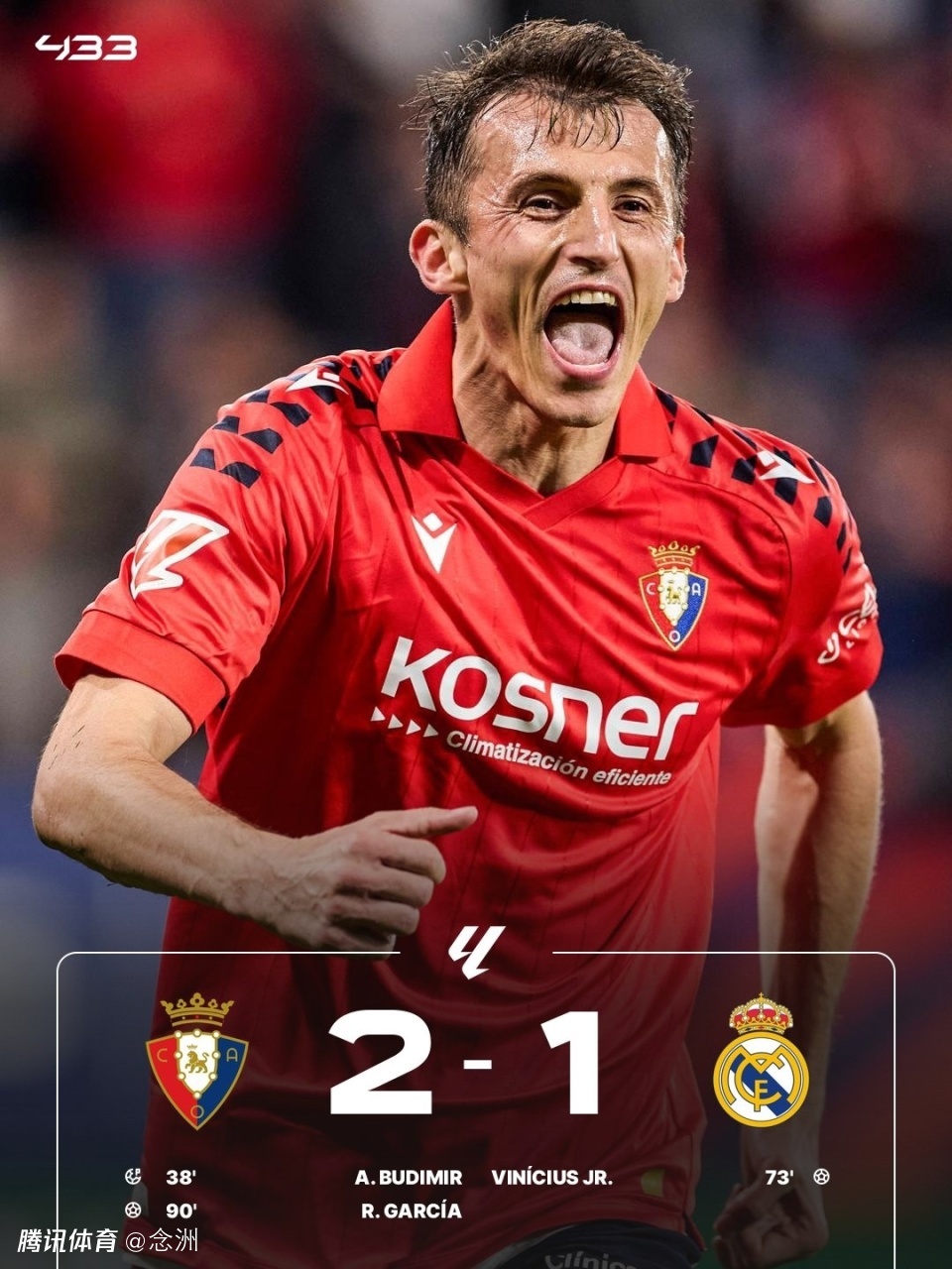 西甲第25轮,皇马客场1-2奥萨苏纳,联赛8连胜终结,先赛一场2分领跑。布迪米尔造点+点射,姆巴佩小角度破门但越位在先无效,巴尔韦德助攻维尼修斯扳平,劳尔-加西亚绝杀。