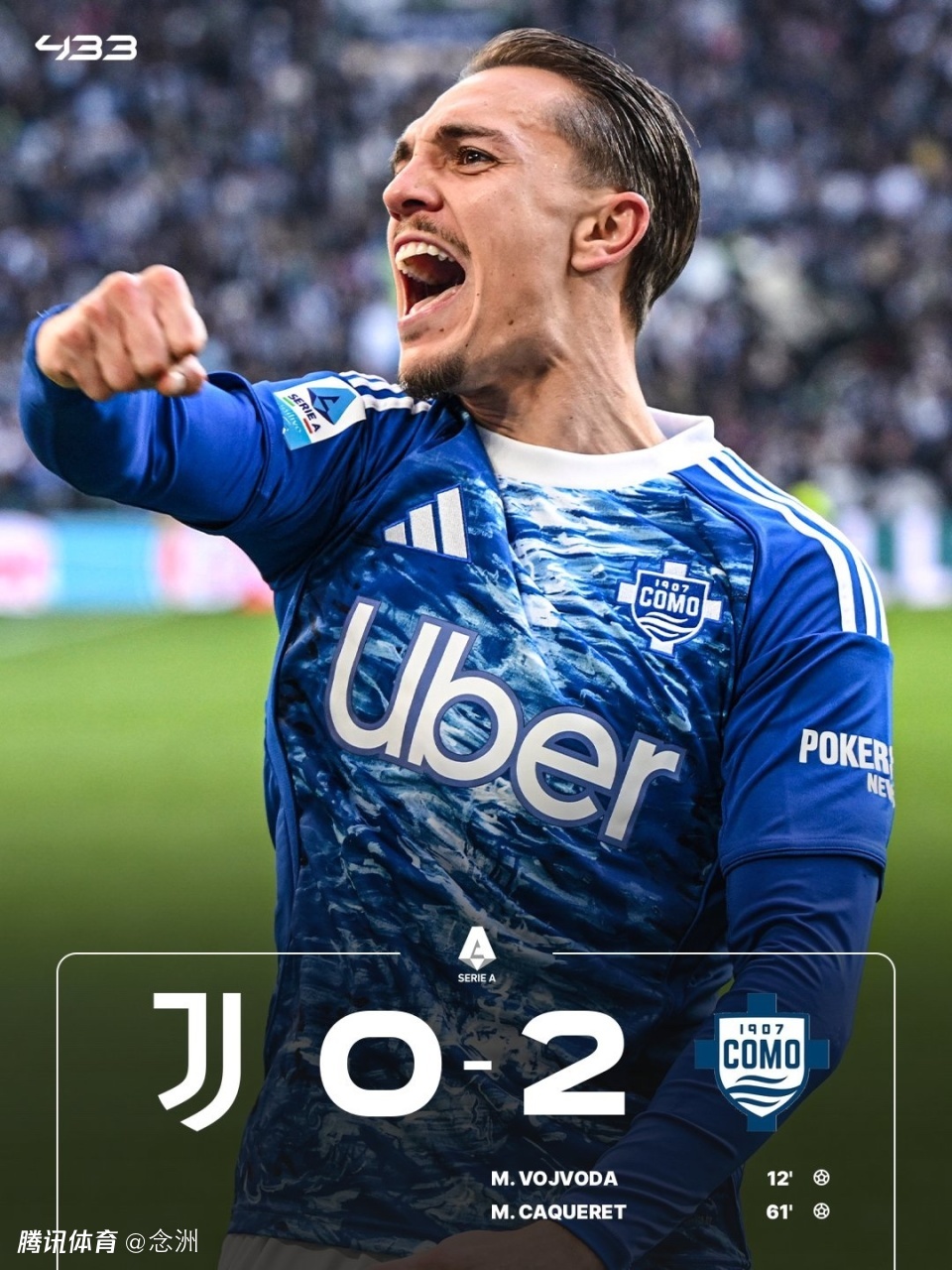 尤文主场0-2科莫,三轮不胜,先赛距前四1分。迪格雷戈里奥扑救失误,沃伊沃达抽射闪击得手,奥蓬达失单刀,达库尼亚中楣,卡奎雷特反击推射破门,库普梅纳斯任意球中柱。