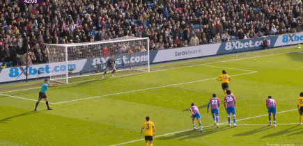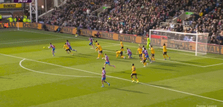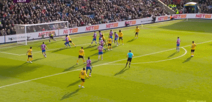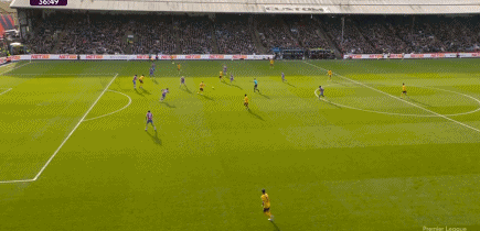 第35分钟,水晶宫开出战术角球,沃顿做球,皮诺插上推射击中立柱。