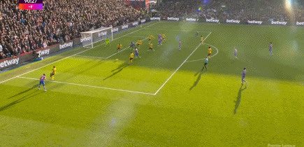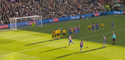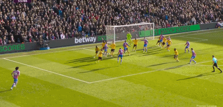 第35分钟,水晶宫开出战术角球,沃顿做球,皮诺插上推射击中立柱。