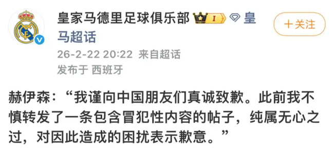 皇马的道歉声明,发布在微博上,微博主要面向中国用户。皇马俱乐部全球账号(INS、X等),以及赫伊森本人账号均未回应。