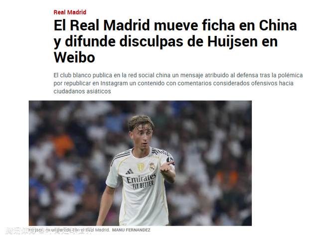 赫伊森的辱华事件,引发多家媒体关注。西班牙COPE电台、埃菲社、葡萄牙《纪录报》等媒体,都报道该事件。如果皇马俱乐部、赫伊森本人,仅仅是通过微博“特供道歉”,中国球迷不会满意。